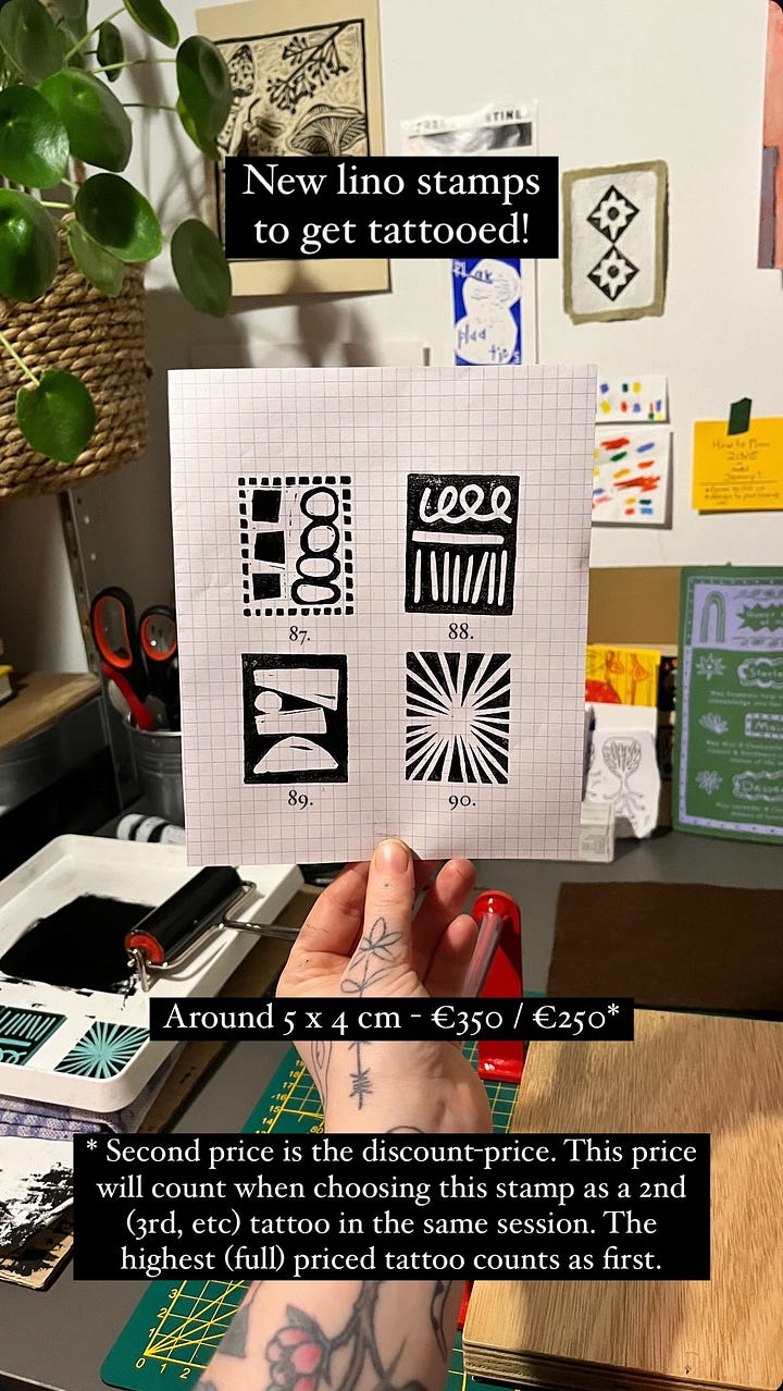 I would like to use this time to translate your lino stamp ideas. In the form below, you can suggest an idea that I will translate into a tattoo-able lino stamp!